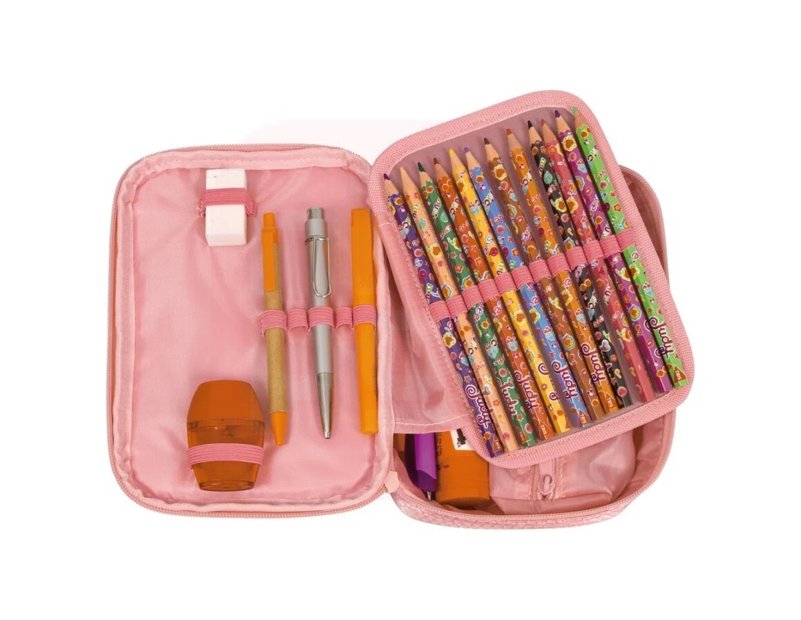 Além disso, o estojo tem fechamento em zíper e organizador interno com elástico, assim, deixando seus materiais muito mais organizados!